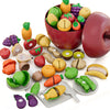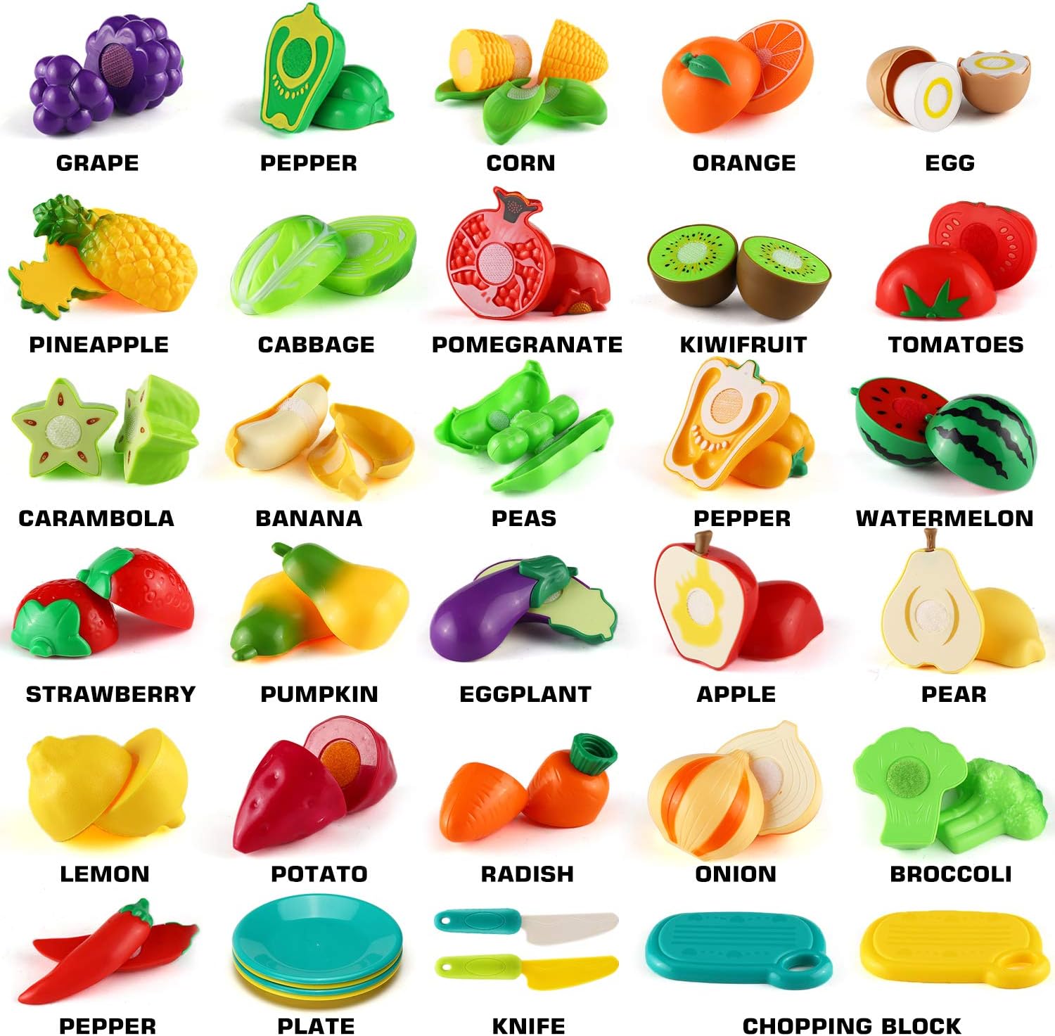 25 items pretend play food set for toddlers: 25 different kinds of play fruit and vegetables (can be separated into 61 small pieces), a toy grocery basket, 2 cutting boards, 2 kitchen knives, and 4 dinner plates.
