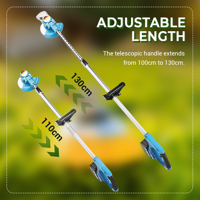 ADJUSTABLE LENGTH – The telescopic handle extends from 100cm to 130cm. This feature reduces strain on your back and arms, making it easier to tackle hard-to-reach areas like under bushes or along fences. Plus, its compact size fits effortlessly in your car trunk.