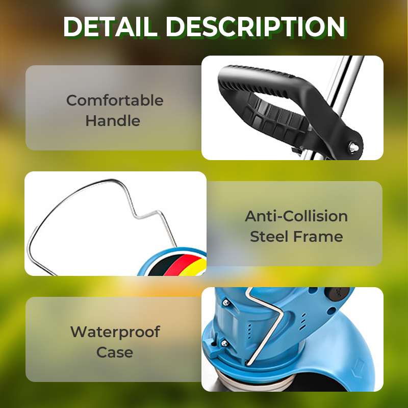 DUAL SAFETY SWITCH – Designed with a dual-control switch, this tool ensures safe operation by preventing accidental starts. And the anti-collision steel wire frame prevents the blades from striking hard objects like rocks.