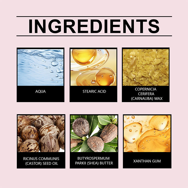 Product Ingredients: Water, Stearic Acid, Ricinus Communis (Castor) Seed Oil, Xanthan Gum, Butyrospermum Parkii (Shea) Butter, Carnauba Wax